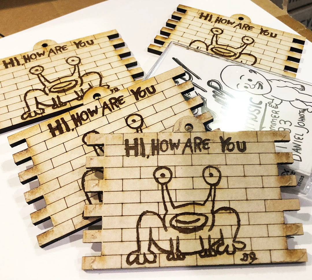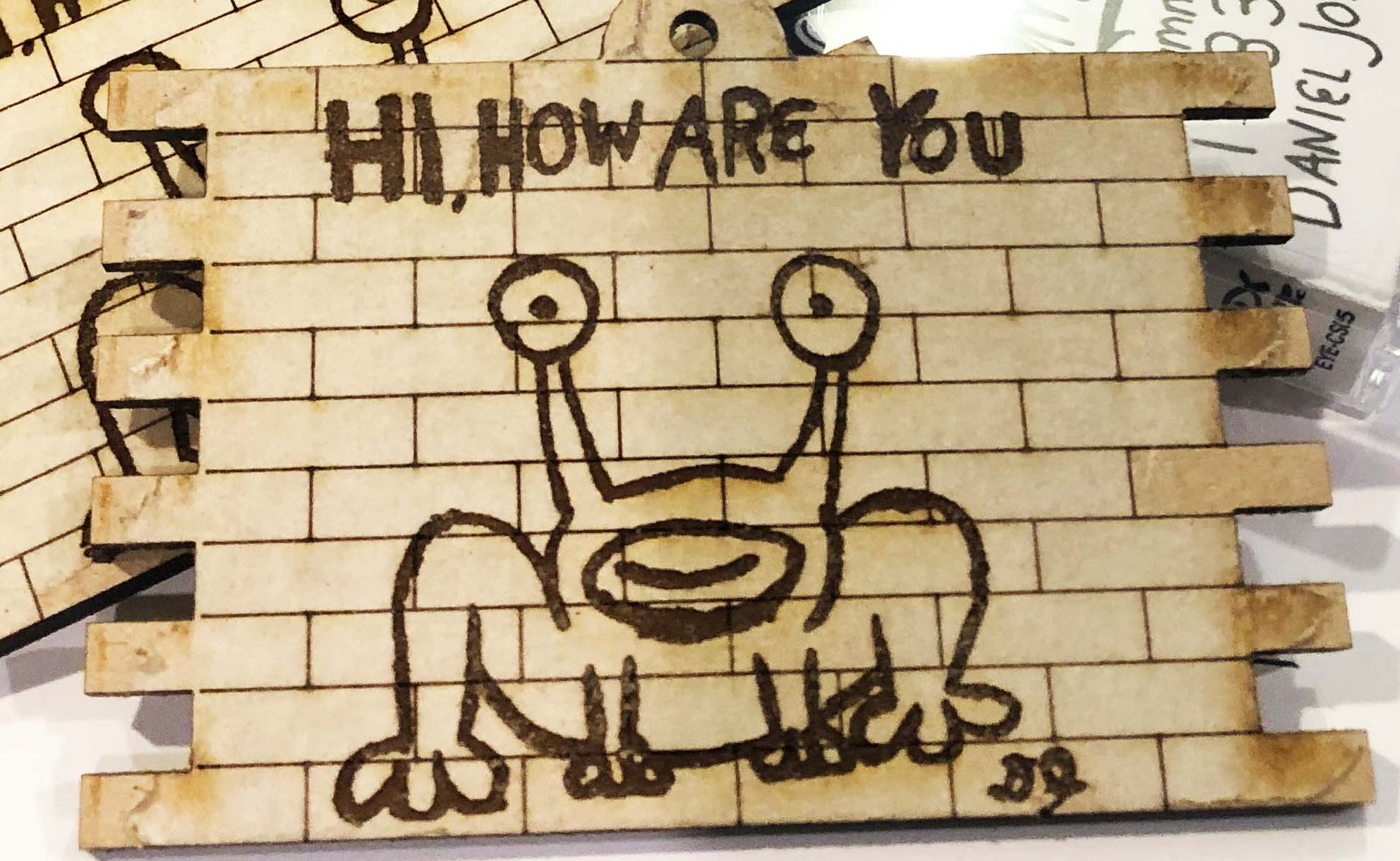 Laser-cut reproduction of the MURAL of "Hi How Are You" with Daniel's Jeremiah the frog, painted by Daniel in 1994 on what was then the Sound Exchange music store on the corner of Guadalupe and 21st Street in Austin.