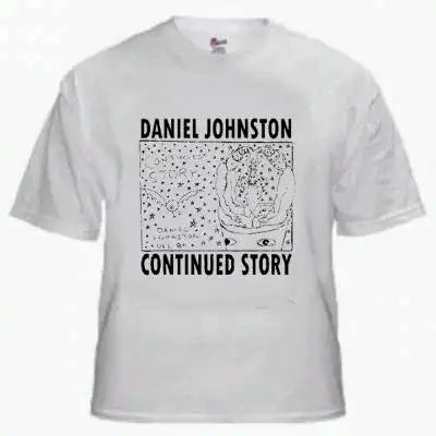 The images from the "Continued Story" cassette tape black imprint on a white t-shirt.