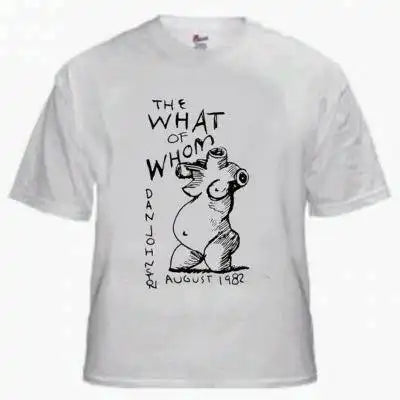 Black imprint on white t-shirt "The What Of Whom" from the 1982 cassette tape.
